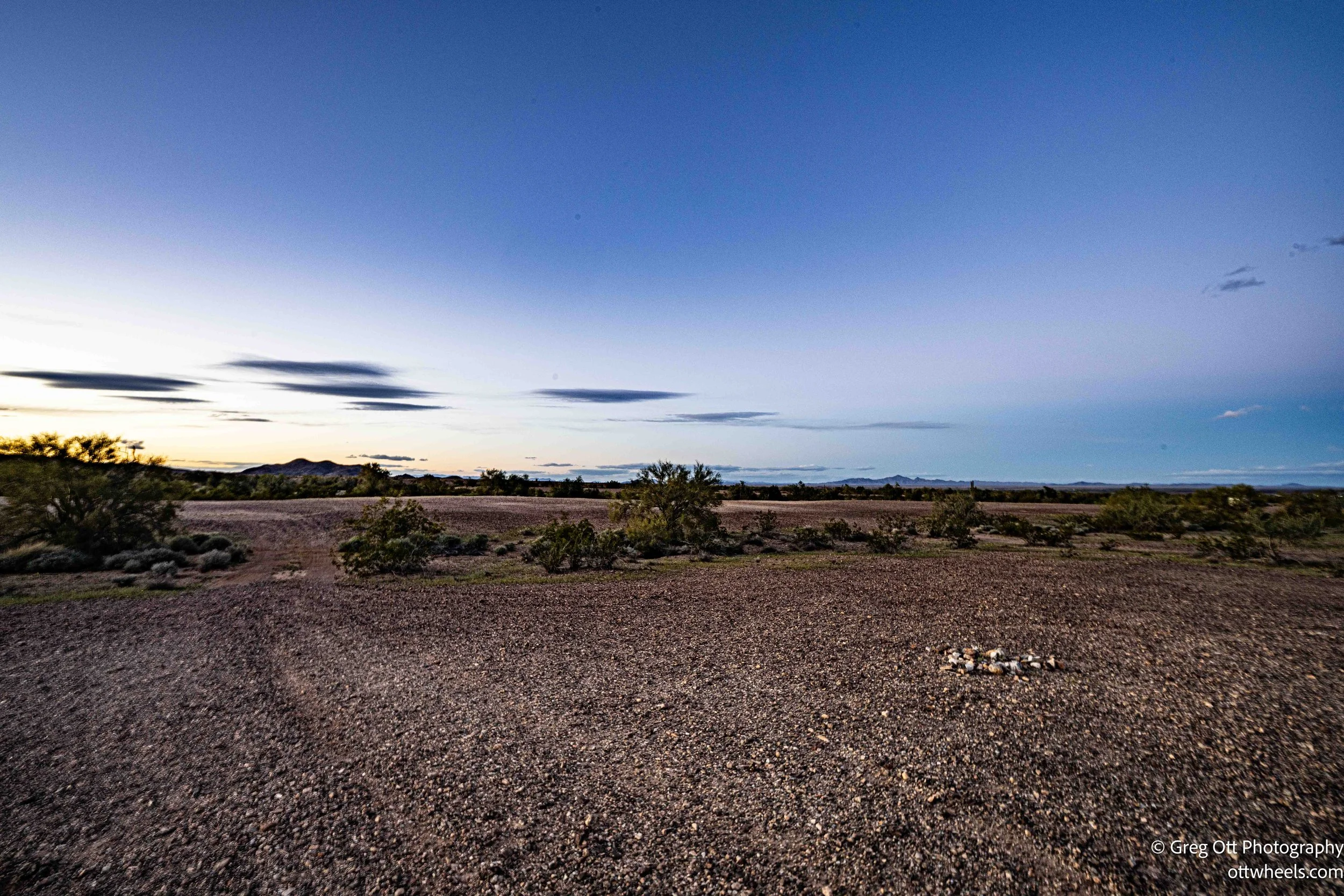 By the time I retraced my path I realized I was still about 40 minutes north of Quartzsite and losing daylight. Just south of Bouse I began seeing more BLM pull-offs with camping rigs scattered well apart from one another. At 5:30 I pulled into one. A sign read “14-Day Maximum Camping.” The rest outlined standard BLM rules. The rigs were spaced roughly a hundred yards apart. I spotted a simple fire ring made of stones and decided that was good enough.
