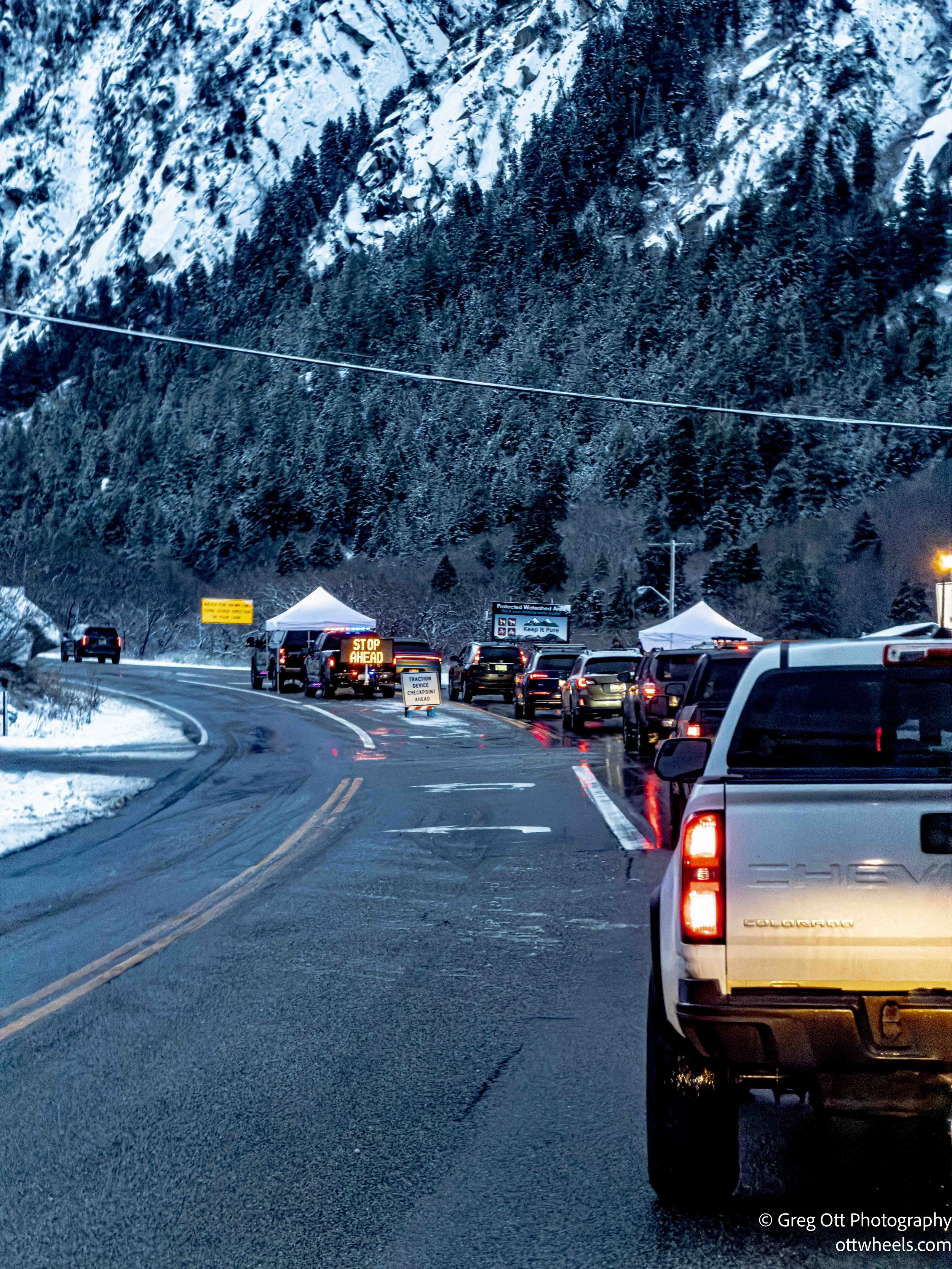 As I approached Little Cottonwood Canyon, signs flashed “Chains / 4x4 Required.” I wasn’t sure whether the slash meant and or or, so I pulled over and put the chains on. At the canyon entrance, there was a heavy police presence, stopping vehicles and making sure everyone was equipped properly.