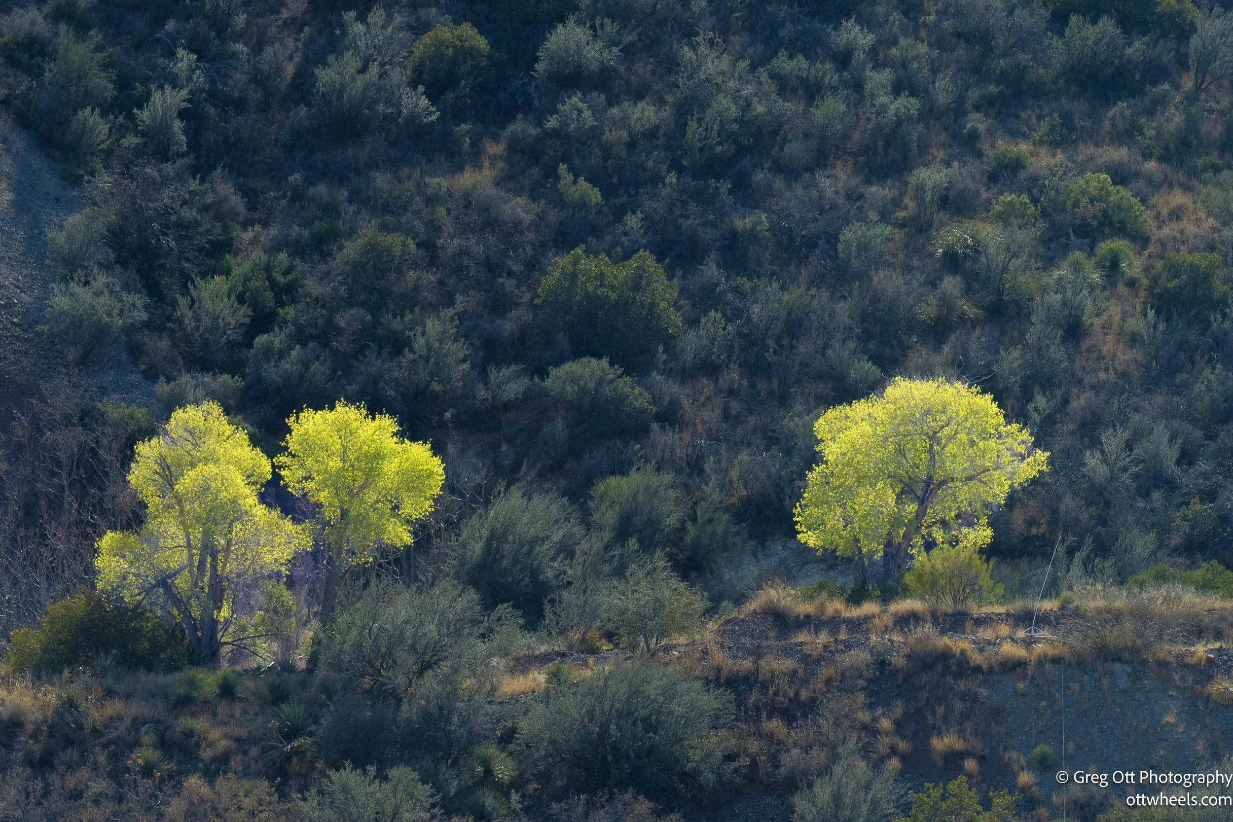 By mid-afternoon I felt sluggish. I hadn’t brought water and my mouth was dry. Across the valley, two bright green trees were glowing in backlight. I switched lenses and tried to capture them. I later learned they were palo verde trees — Spanish for “green stick.” Native to the Sonoran Desert, their bark is vivid green and capable of photosynthesis. When the light hits them from behind, they almost appear illuminated from within.