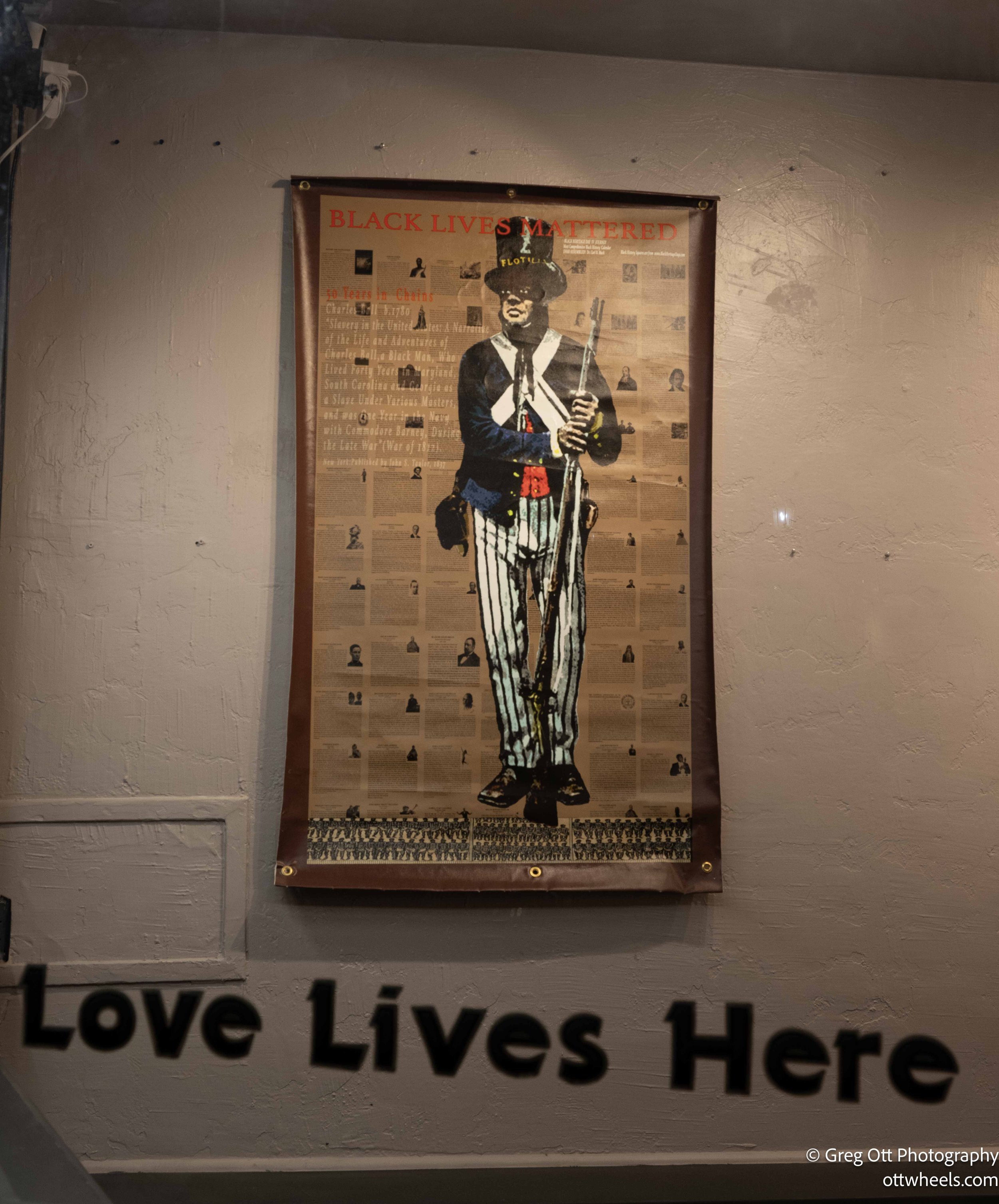 As I headed back, I passed a building with a single art piece inside and the words “Love Lives Here” painted on the window. The rest of the shop was empty. I’m not sure why, but I liked the feel of it as I turned around and made my way back toward the van. The whole town had settled into a calm rhythm. The streets were nearly empty except for a man wrapped in a large white Indian blanket who kept talking to himself. Clearly troubled, but his voice had a tone to it — almost like Gil Scott-Heron — and even the nonsense he was saying sounded strangely poetic in the quiet.