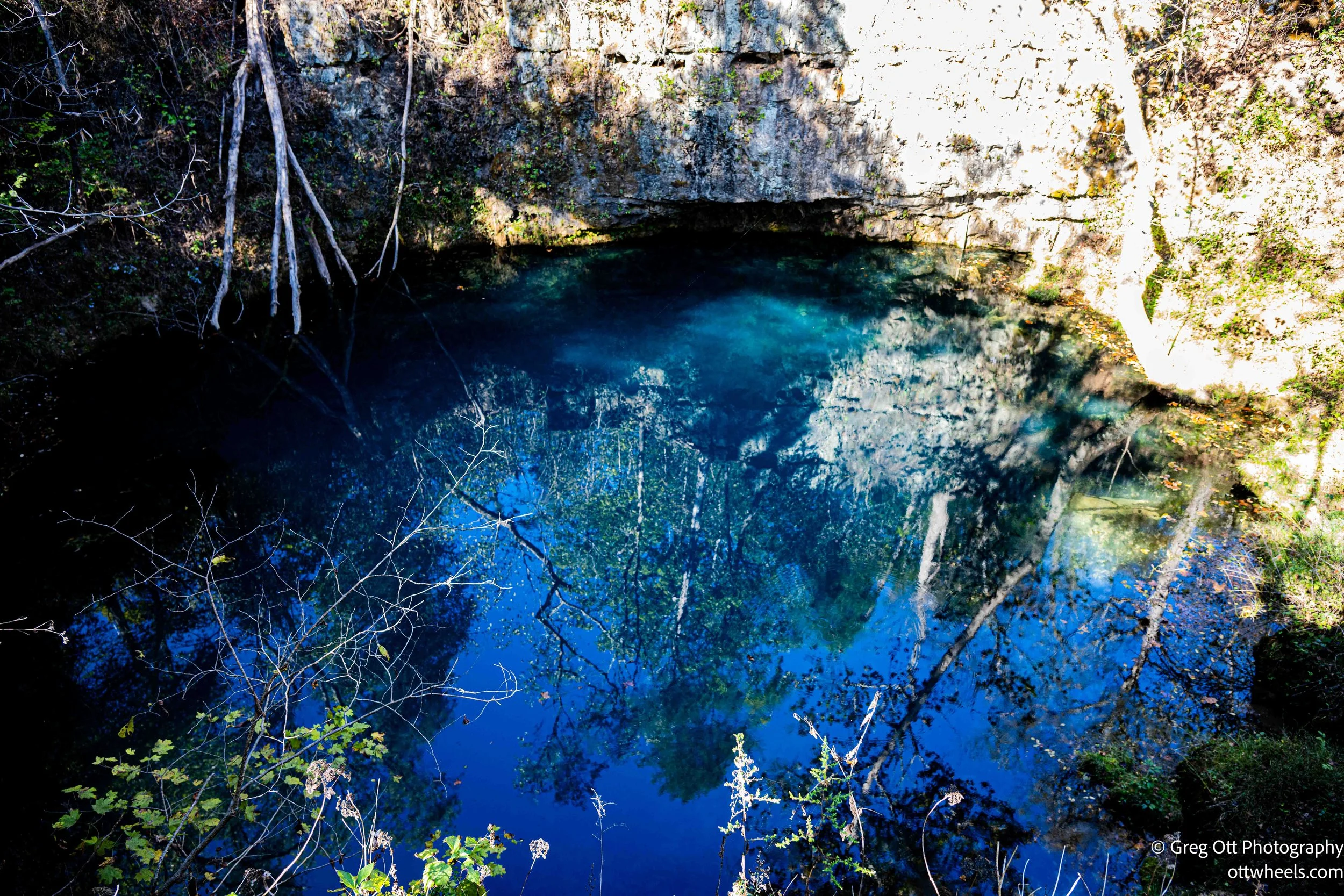 When I arrived, I was surprised to find the visitor office closed. The campground was open, but the access road to the spring’s parking lot was blocked, probably because of the resurfacing. The trail was littered with downed trees by the park service—many hollowed out and crumbling, as if they’d been eaten from the inside. I had picked up a brochure earlier titled Round Spring: An Underground Story, which explained how the same water feeding the spring also carved the nearby Round Spring Cave. Tours were closed for the season, but reading about it made me want to come back. The cave stretches thousands of feet below ground, filled with stalactites.