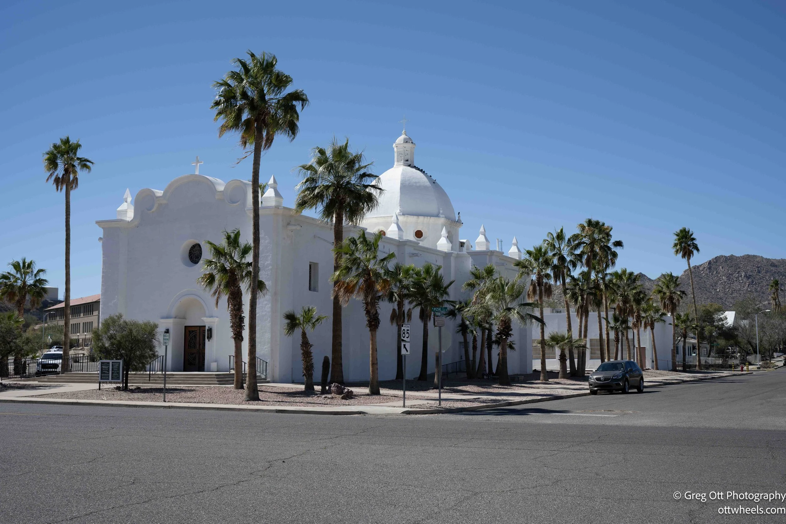 I stopped in Ajo on AZ-85, about twenty miles north of the trail. The white facade of the mission church caught my eye and I pulled over. Immaculate Conception Church rises unexpectedly bright against the desert backdrop. I wandered briefly, then found coffee at Sonoran Desert Inn & Conference Center — my first cup of the day. I sat for about 30 minutes, checked maps, fuel levels, weather, and the usual road-trip variables. The ritual matters.