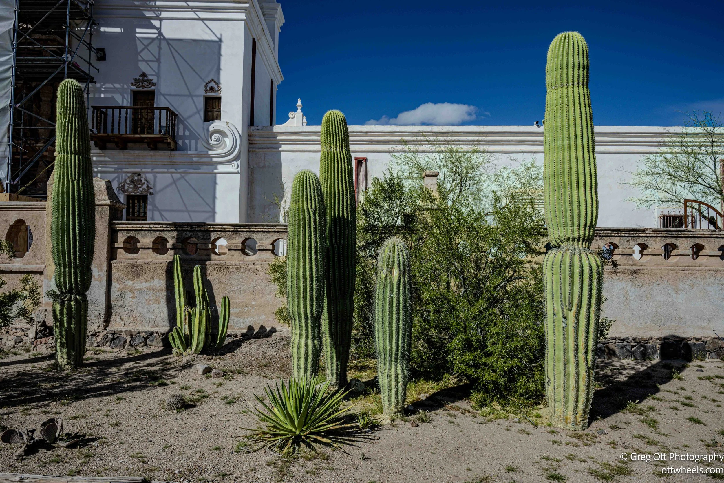 The first thing I saw was scaffolding. The exterior was partially wrapped as crews worked on restoring the plaster. Sections of the white façade were covered, the surface being repaired and preserved. Even so, the mission still dominated the landscape. It rises out of the Sonoran Desert in bright white, set against brown earth and blue sky, looking almost improbable — like it was placed there from another continent and another century.